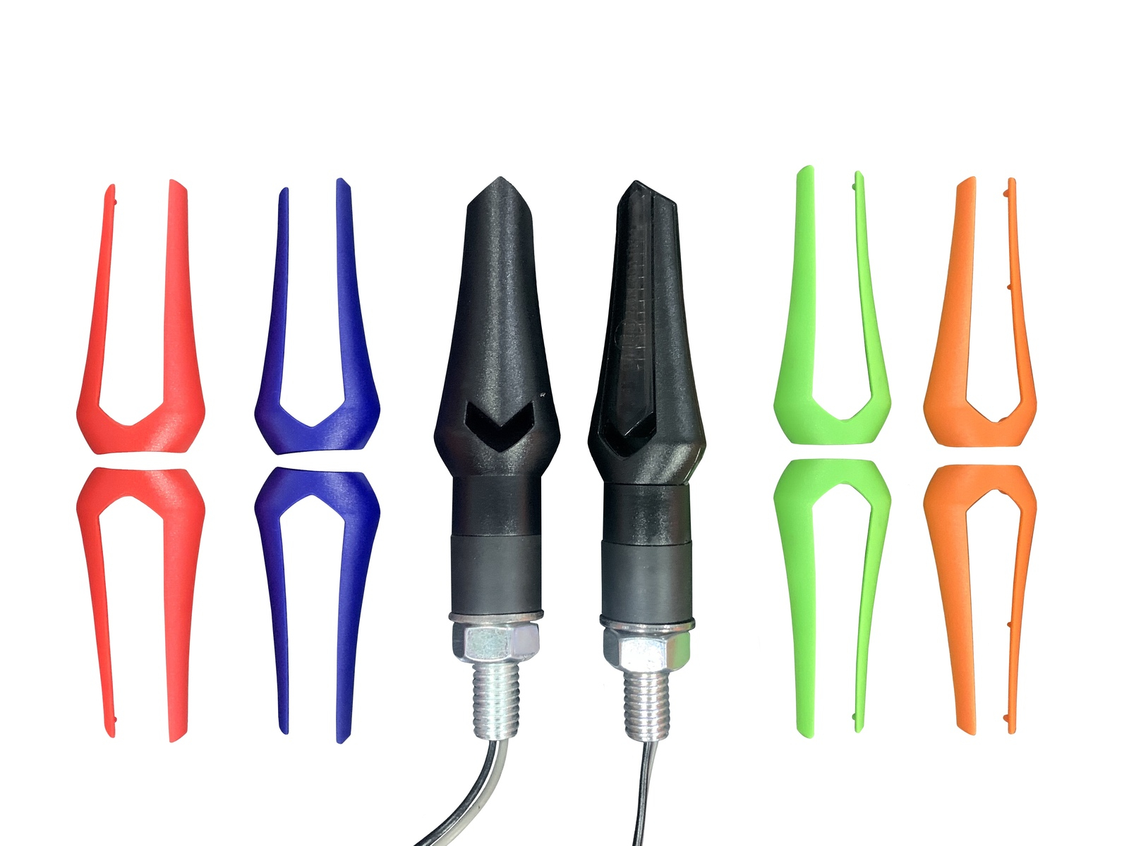 MCS Chameleon LED Changeable Cover Indicators. Bright Chameleon Led indicators with interchangeable cover surrounds. Chose from Black, Green, Blue, Orange or Red to suit your motorcycle. E marked. Sold as a pair