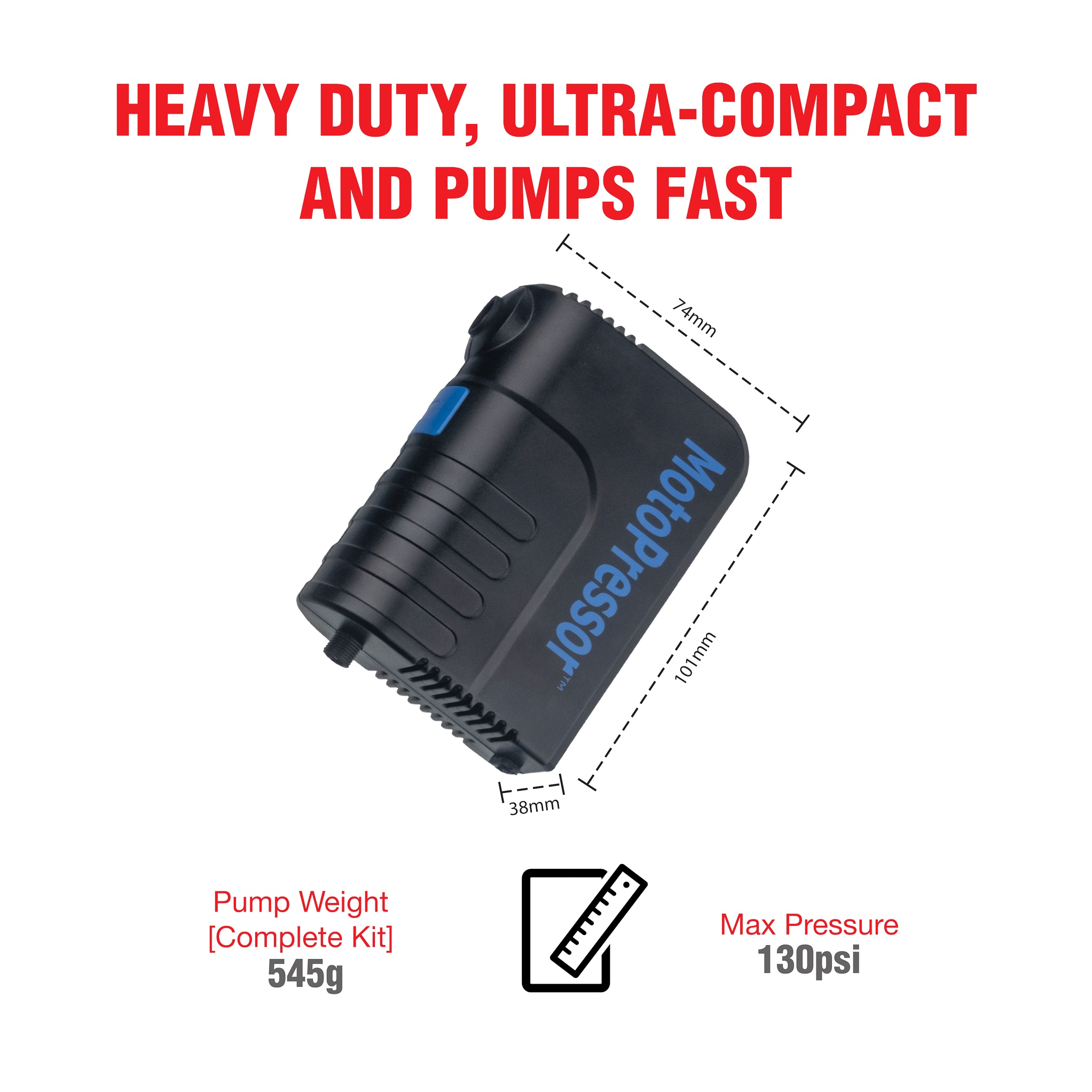 To continue the success of the pump, we decided to change it up a little, and have finally put a cover on it! Because technology has changed quite a lot in the last 10 years, we have also managed to make the pump SMALLER (100*74*37mm) in size and halve the weight of it (345g). It still pumps over 130 psi and will inflate a 150/70 R18 tyre from 0 to 31psi in 3 minutes.